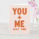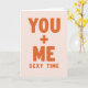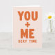 This card keeps things simple, with big centered words that do all the talking. The top line reads “YOU + ME” in burnt orange letters, with a clear plus sign between the words. Just below, “SEXY TIME” appears in the same color but a bit smaller, still centered on the page. The background is a soft blush pink, and the warm orange text stands out in a cozy, flirty way. The letters are rounded and easy to read, with a faint shadow that makes them look slightly raised. There aren’t any characters or extra objects, which makes the message feel direct and private between the two of you 🥰. It’s a fun choice for a partner you can be honest with, and it’s a sweet way to share Valentine’s Day feelings ❤️.