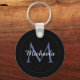 Minimalistic blue circle modern monogram with blue initial and white name on black. Personalizable custom name with a serif initial behind on a black color.