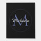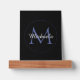 Minimalistic blue circle modern monogram with blue initial and white name on black. Personalizable custom name with a serif initial behind on a black color.