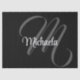 Minimalistic modern monogram initial name black white. Personalizable custom name with a cursive initial behind on a black color.