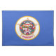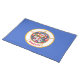 Crafted with meticulous attention to detail, this placemat is more than just functional; it's a celebration of Minnesota's heritage and cultural identity. The design proudly showcases the state's iconic blue background with a gold fringe and a central shield, featuring symbols like the state motto "L'Etoile du Nord" (The Star of the North) and images of a farmer plowing a field and a Native American riding a horse, symbolizing the state's agricultural and indigenous roots.