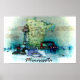 A minnesota poster with a state map, lighthouse, Lift Bridge, and loon.