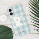 Show some home state pride with this cute rustic style phone case featuring a white silhouette map of the state of Minnesota with a pink heart inside, on a hand drawn buffalo plaid background in pastel mint green and white. Add a name, monogram or phrase at the bottom in handwritten script lettering. You can even change the position of the heart to your home city by opening the design tool and dragging the heart shape to your favorite spot!