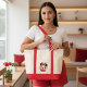 Love the durable cream colored canvas and navy blue contrasted handles. Perfect for carrying my laptop and papers.