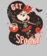 This bold and playful illustration features Minnie Mouse in a spirited Halloween theme. Dressed as a skeleton with a festive witch's hat, Minnie is joyfully stirring a bubbling cauldron under a starry night. The words "Get Spooky" set the tone, while bats and a floating skull add to the eerie yet charming atmosphere. The design uses a striking contrast of black and red on an orange background, capturing the essence of a fun and spooky Halloween.
