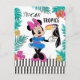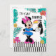 This cute summer graphic features Minnie Mouse holding a toucan among tropical flowers and stripes.