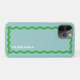 A trendy take on the wavy line motif with a squiggle frame in bright green on a background of modern mint with one simple line of editable text for easy customization with a name makes this a fun updated phone case for your tech.