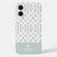 Stylish custom phone case in gray, mint and white colors. This design features a preppy Moroccan trellis pattern. Personalize it with your name monogram or other custom text with a cute heart symbol. Use the design tools to choose any background colors, edit the text fonts and colors and upload your own photos to create a unique one of a kind device cover!