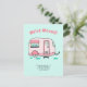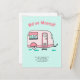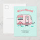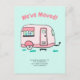 Mint pastel camper van illustration moving announcement with whimsical hand drawn house, with pink, turquoise colors, windows and cactus plants.