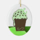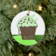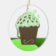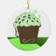 A sweet mint chocolate cupcake with chocolate sprinkles. Swirls and a little green bow on the top. A festive green border along the bottom.