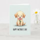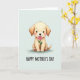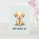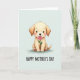 This card features a fluffy, golden-toned dog centered on a pale mint background, gazing forward with big dark eyes and a small, gentle smile that feels like a quiet thank-you ❤️. Its rounded ears frame the face, and soft shading gives the fur a cozy, touchable look under even, calm lighting. A pink rose is held carefully in its mouth, like a sweet offering shared between close friends or family. Light rosy blush warms its cheeks, and the paw pads are hinted in a matching pink that ties the details together. Near the bottom, the text “HAPPY MOTHER’S DAY” sits neatly beneath the illustration in black, flowing lettering that’s easy to read. The simple palette of creamy gold, soft pink, and cool mint keeps the focus on the tender gesture 🌼. The rose petals are a bright pink with layered curves, and the stem angles slightly upward across the dog’s muzzle.