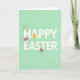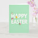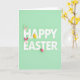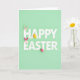 This card features the words “HAPPY EASTER” centered in large white letters across two lines, with soft shading that gives them gentle depth on a pastel mint-green background. The text sits like a friendly sign in an open spring sky, leaving plenty of breathing room around it. Peeking from behind the letters are two sets of pale pink bunny ears with bright magenta inner details, as if two little friends are leaning in together 🐰. A sunny yellow egg with warm orange stripes is tucked into the top line of text, adding a cozy, shared-gift feel to the layout. Below, a fuchsia egg dotted with small yellow circles nestles into the lower line, bringing a sweet, companionable contrast 🌷. The overall look stays simple and modern, with the decorations placed so they seem to interact with the lettering rather than float separately. Two pink ear shapes rise just above the white letters, and the mint-green background remains smooth and untextured.