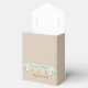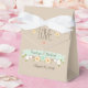 Add the names of the bride and groom, wedding date and special message for your guests on this pretty custom rustic floral boho style tent shaped favor box with a ribbon and khaki sand colored background and printed mint light green and jade ribbon look banner with a white cherry blossom branch, sunflower, brown eyed susan and aqua teal blue wild rose tulip and posy laurel wreath design. The back of the box has a cream off white hued paper doily look design. These favor boxes perfectly compliment a bohemian chic, country western, farm, farmhouse, barn, barnyard or outdoor garden themed special occasion like a wedding, bridal or couples shower, engagement party, rehearsal dinner or anniversary celebration. Your special message on the back is flanked by two coral hearts. Artwork and design © Chrissy H. Studios, LLC. All rights reserved.