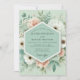 Delicate mint green hues embrace a cascade of soft peach and creamy white blossoms. This ethereal design evokes a sense of tranquil romance with its gentle floral artistry. Perfect for a dreamlike occasion.