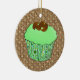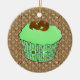 Ornament of a Cupcake with green mint frosting topped with chocolate curls, in a decorative, green fractal cupcake wrapper, on a brown and beige swirl patterned background