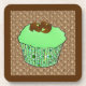 Cupcake with green mint frosting topped with chocolate curls, in a decorative, green fractal cupcake wrapper, on a brown and beige swirl patterned background coaster