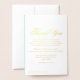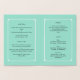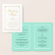 Folded wedding menu in gold, white, and mint green. The cover of the menu is white with gold foil details, a simple frame and elegant fonts. Add your wedding menu inside in black text against a mint green background. On the back, you can write a thank you note to your wedding guests in gold foil.