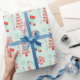 Festive Christmas wrapping paper done in a mint green and white polka dot pattern, with coral and mint green Christmas trees, snowflakes, and stockings. Custom text reads Merry Christmas and Happy Holidays, and can be personalized to read what you want. Great for all ages.