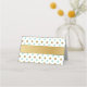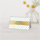 Pretty folded place card done in a mint green and gold on white small polka dot pattern. Graphics of a gold tone ribbon, runs across the front and back of the card. Personalize the custom text, on the back of the card to read what you want. Personalize the front of each card, by hand, for your wedding reception.