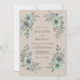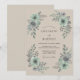Delicate mint green and soft grey botanical elements create a romantic, whimsical atmosphere. Lush floral arrangements and trailing foliage evoke a sense of natural elegance. This design sets a serene and charming tone for your special day.