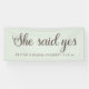 Mint green bridal shower banner with text in a cute, cursive script font, "She said yes." Personalized with the name of the bride-to-be and her shower date.