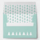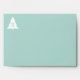 Custom mint green holiday card envelope features a geometric white Christmas tree with a custom monogram inside it on the top left of the front. The back flap has a customizable printed return address. On the back there is also a row of 7 white trees which goes across the bottom. Add your monogram initial, name and address in the sidebar. A modern geometric pattern of light green Christmas trees on white is printed inside the envelope.