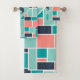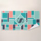 A bold and fresh geometric design with squares and rectangles in different shades of mint and teal green, coral pink, and dark blue. The monogram sits prominently in the middle on a light teal-colored diamond. Personalize the bath towels and make them uniquely yours. You can change the color of the diamond and monogram if you want a more contrasting look.