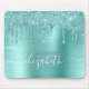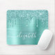 Custom elegant and girly mouse pad featuring mint green faux glitter drips and a mint green faux brushed metallic background. Monogram with your name in a stylish trendy white script with swashes.