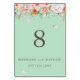 This table number card features peach and white flowers with greenery and white ribbons on top of a mint green background. The rose petal confetti adds an additional final ‘wedding day’ touch. This would suit anyone looking for a romantic and classically contemporary wedding, perfect for a spring to late summer wedding. The card prints on the front and back (double-sided). Add each table number that you need to your cart individually.