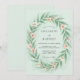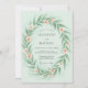 This design features a soft mint green background adorned with a delicate wreath of verdant leaves and pale peach blossoms. The ethereal watercolor aesthetic creates a romantic and serene mood, perfect for an outdoor spring event. The palette focuses on pastel tones and natural botanical elements to evoke a sense of graceful elegance.
