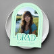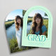 Introducing our mint green arch photo graduation announcement—a sleek, modern keepsake designed with minimalist elegance. The front features an arch-shaped photo with a thin border and the word "grad" partially overlaying the photo. Text is in turquoise. Personalize the template by adding your graduation year, name, and school to create your announcement with ease. On the back, upload a full-sized photo and include a signature line. © Kimbellished, LLC