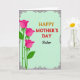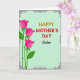 This card features a calm mint green background with a faint diagonal texture that feels gentle and welcoming ❤️. A thin border frames the design, with decorative gray and mauve flourishes curling at the corners and along the edges like classic stationery trim. Along the left side, three closed rosebuds stack vertically in bright fuchsia, their slim green stems and small leaves leaning upward in a sweet, affectionate way. The flowers sit close to the border, as if tucked in like a thoughtful little bouquet. On the right, the word “HAPPY” appears near the top in warm orange, followed by “MOTHER’S DAY” in larger, strong red letters centered beneath it. Below that, “Sister” is written smaller in black, placed like a tender tag under the main message, with a soft, caring feel 🌼. The overall layout balances the floral column on the left with the text on the right, all set inside the gray-and-mauve ornamental frame. The fuchsia buds remain closed, with simple leaf shapes and a neat vertical alignment against the mint background.