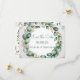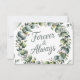 A delicate wedding greeting card featuring a beautifully detailed watercolor eucalyptus wreath rendered in shades of mint green and sage green, encircling a subtle, textured white background. The wreath incorporates scattered sprigs of baby's breath and tiny pearl-like accents, creating an elegant and slightly rustic feel, with a soft glow enhancing the watercolor effect. Across the center of the wreath, the text “FOREVER & ALWAYS” is displayed in a flowing, modern script font in a soft silver-grey, complementing the natural tones and evoking a sense of timeless romance. The card’s interior provides ample space for a heartfelt message and incorporates a simplified eucalyptus sprig illustration in the bottom corner, maintaining the serene and celebratory emotional tone.