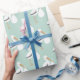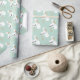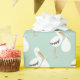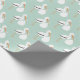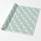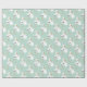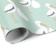 Baby shower wrapping paper featuring a pattern of storks carrying bundles of joy against a muted mint green background.