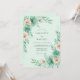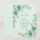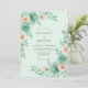 A soft mint green backdrop sets the stage for this ethereal design featuring watercolor botanical elements. Lush teal greenery and delicate peach blossoms create a fresh, airy aesthetic. The painterly style and serene color palette evoke a romantic atmosphere, perfect for a seasonal spring ceremony.