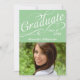 White swirly script text, whirling and curling around with "graduate", and a photo to announce the big achievement. Whimsical and fanciful cursive with the word Celebrate on the back.