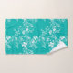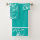 This bathroom towel set features a pretty white ocean themed design on a mint green background. The hand towel and wash cloth have the pattern repeated across the entire surface; the large bath towel has the pattern as a bottom border, with a matching solid teal interior. Be sure to see the matching products, including shower curtains, in our store.