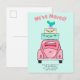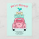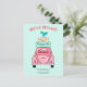 Mint pastel suitcases car illustration moving announcement with whimsical hand drawn vehicle, with pink, turquoise colors and cactus plants.