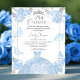 Unmask the enchanting allure of your quinceanera celebration with unique dusty blue dress-themed invitations. These bespoke invitations, inspired by lush dusty blue florals and whimsical butterflies, not only set the anticipation for the event but also hint at the stunning red quinceanera dress reveal. They're completed with confetti details and a tiara accent, embodying the celebratory grandeur of the special day.