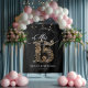 Quinceanera party backdrop with gold design, white script on black background