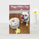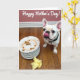 This card shows a cozy kitchen moment where a small, light-furred dog with a short snout and big, round eyes steals the scene on the right, tongue out as if it just sampled something tasty. Its perked ears and direct gaze feel like a cheeky confession, the kind that makes you smile at the “caught in the act” look. On the left, a tidy stack of glossy white plates sits with a few brownish crumbs and a bit of sticky smudge, like a quiet hint of mischief after a family meal. A soft yellow dish cloth lies rumpled on warm wooden floorboards, adding to the lived-in, affectionate feel ❤️. The background is a smooth rosy-pink wall with gentle light that softens the edges and makes the floor’s grain stand out. Across the top, the words “Happy Mother’s Day!” appear in white lettering, centered and easy to spot, like a sweet note hovering over the scene 🌼. A small bone-shaped tag hangs from the dog’s dark collar, catching a tiny highlight against its bright coat.