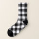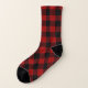 Mismatched buffalo plaid socks in red and grey tones for cheerful holidays.