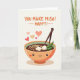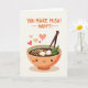 This greeting card combines food and affection in a simple, cheerful style. At the center is a smiling bowl of miso soup with gentle eyes, a soft grin, and a light blush on its cheeks. Inside the bowl are neatly drawn noodles, white tofu cubes, and fresh green toppings, all carefully detailed. A pair of brown chopsticks rests beside the bowl, adding balance to the scene. Above it, hearts in coral, pink, and cream float softly, expressing warmth and care. The creamy white background keeps the focus on the bright colors and friendly character. The overall feeling is light, warm, and affectionate, making this a lovely Valentine’s Day card ❤️