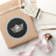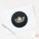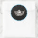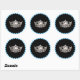 Round sticker is shown with black background with a silver looking crown image. Has a splash of color with a sky-blue border.