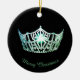 Decorative ornament shown in Black with a round shape with a gleaming pastel Green crown print and coordinating text of Merry Christmas. Customize this item or buy as is.