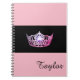 Notebook shown with a photo print of a gleaming Pink colored crown print on a black background and a personalized name. Notebook shown in Pink. Customize this item and change the name to yours or take off, or purchase as shown.