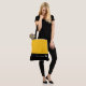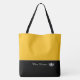 This cute stylish large tote bag is shown in Saffron Yellow and black bottom color block style with a pageant crown and custom text. Has Accent stripe.