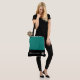 This cute stylish large tote bag is shown in a Bahama [Teal Green] and Black color block style with a pageant crown and custom text.