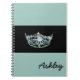 Big, Bold & beautiful. This notebook has a large gleaming Teal colored round crown similar to Miss America perched in the center front atop a Black cross stripe. Your custom name in large text (shown in a script) on lower front corner. Custom this to your own personalized notebook.