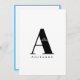 This flat note card/invitation has a personalized monogram on the front with a small-sized tiara inside the black monogram with your last/or first name beneath. Backside has a solid color border of your choice. Border color shown in sky blue.